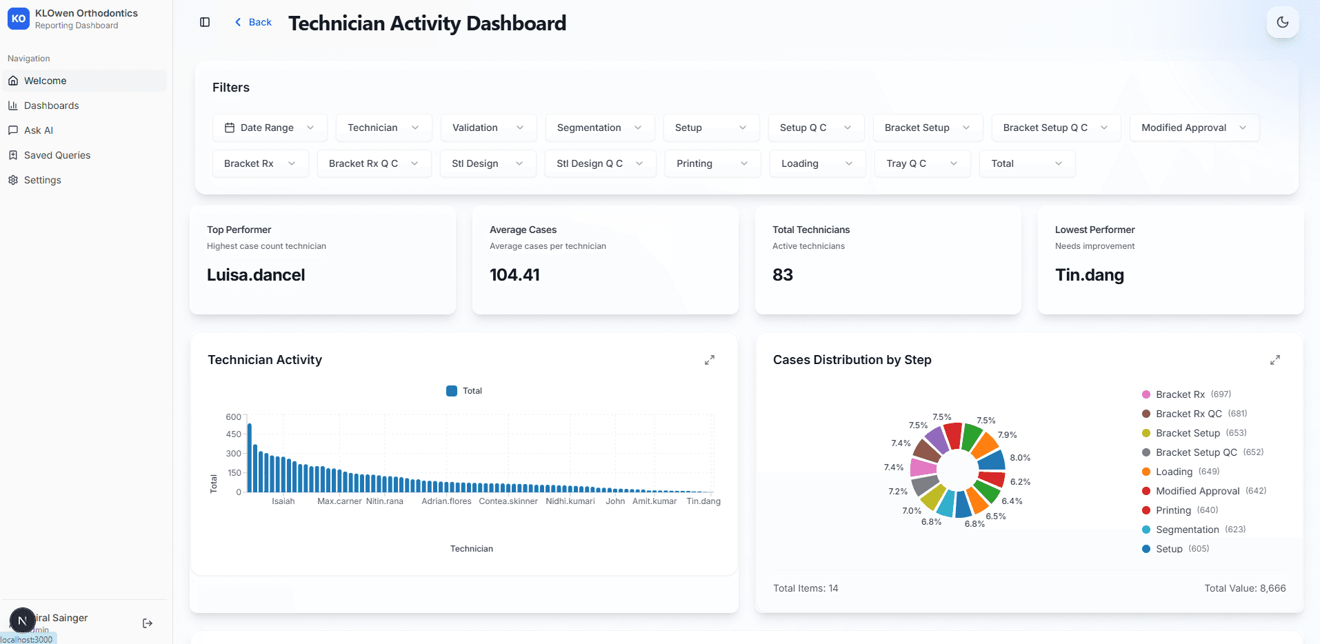 KLOwen Orthodontics, a leading innovator in customized braces systems, recognized a recurring challenge: dentists and practice administrators struggled to quickly access actionable insights from scattered data sources such as LabOS databases, HubSpot CRM, spreadsheets, and ERP systems.